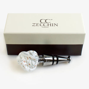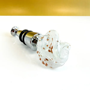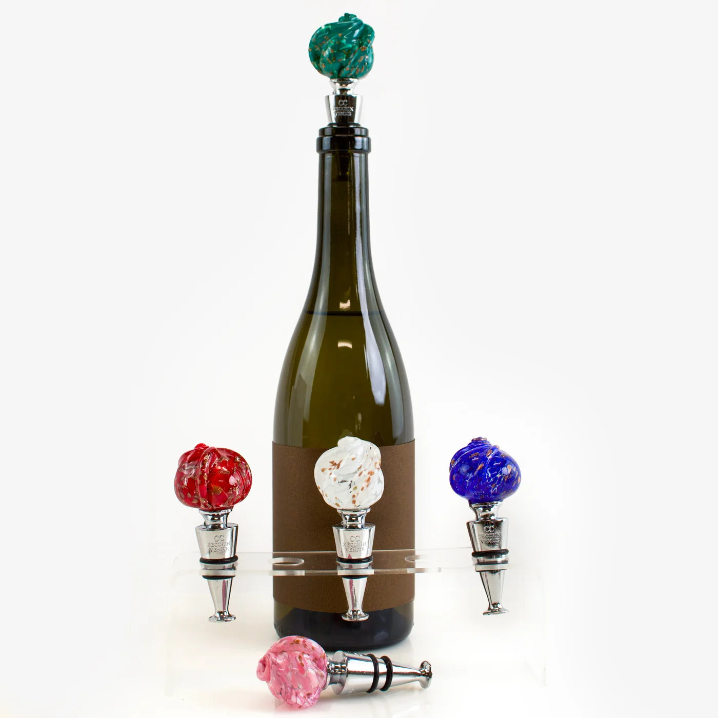Handcrafted Murano glass wine stopper featuring an elegant rose design. This Italian-made piece combines functionality with artisanal beauty, perfect for preserving your wine while adding a touch of sophistication to your table. The delicate rose motif showcases traditional glassblowing techniques, making each stopper uniquely colored and patterned. Fits standard wine bottles securely. An ideal gift for wine enthusiasts and lovers of fine Italian craftsmanship.