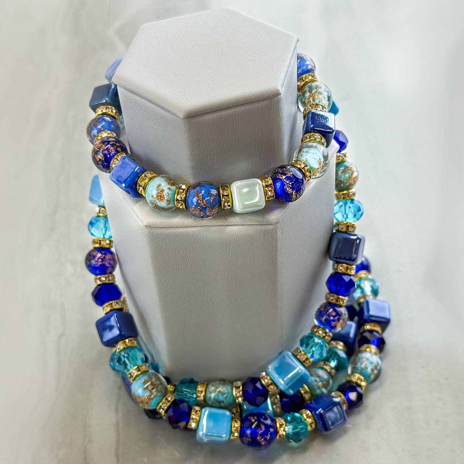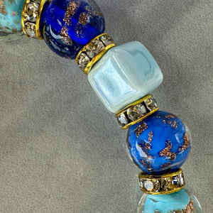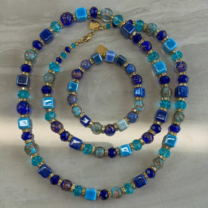 Discover the magic of Italy with this enchanting Bellagio set featuring a stunning necklace and matching bracelet. Handcrafted Murano glass beads in captivating blue tones—mixing cubes and rounds—create a dynamic, eye-catching look. The 32-inch necklace features an adjustable clasp for the perfect fit, while the elastic bracelet adapts to any wrist. Mix and match these pieces or wear them as a coordinated pair to infuse your everyday style with authentic Italian charm and vibrant color. Pure artisanal beauty that celebrates la dolce vita.