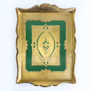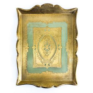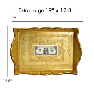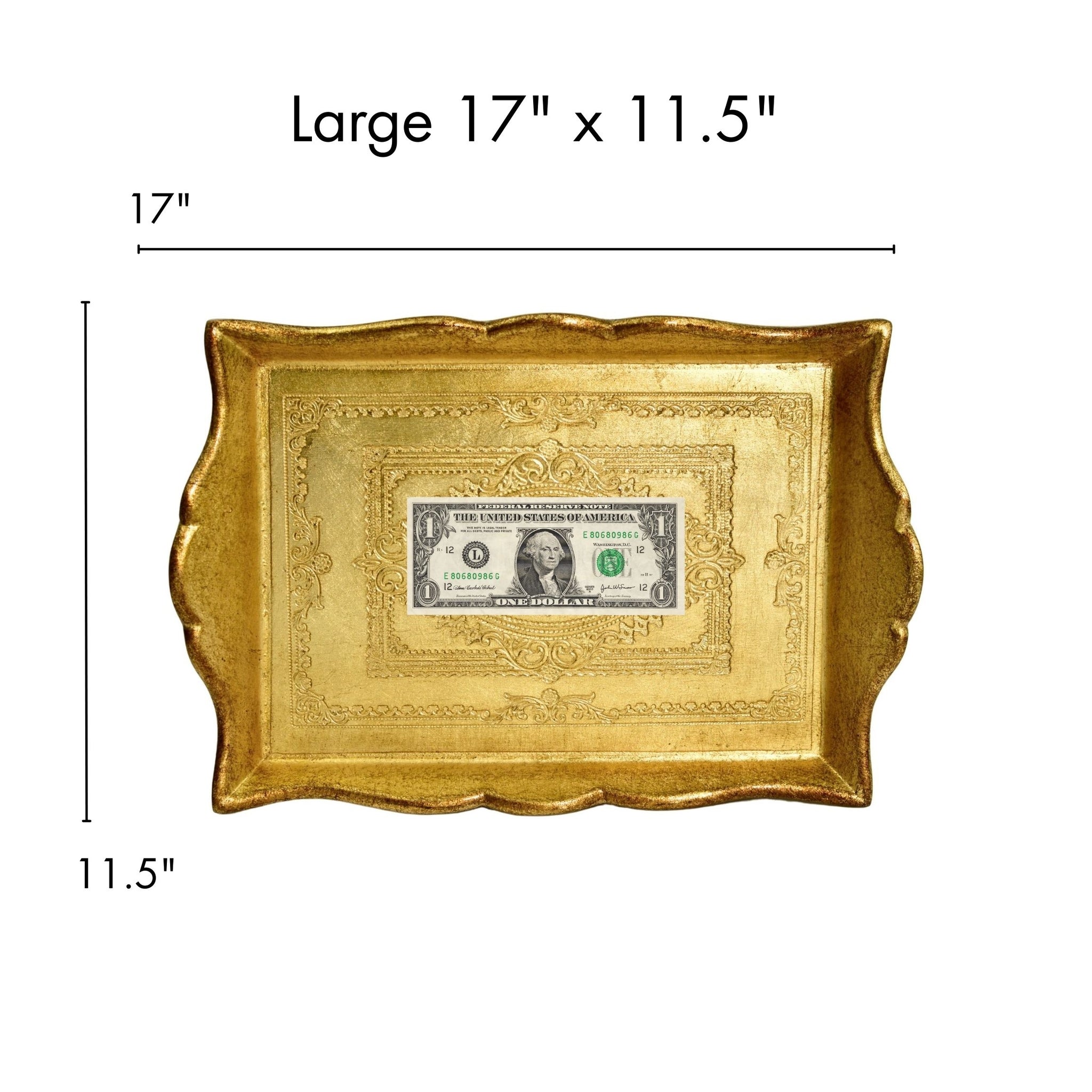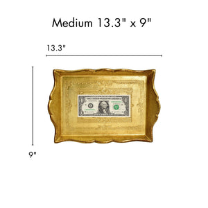 A classic high sided Florentine carved wood tray in two sizes that nest together perfectly. Handcrafted in Italy, this tray boasts carvings tooled by hand, and a stunning gold foil finish. Its deep sides ensure spill-free serving, making it perfect for any occasion.
