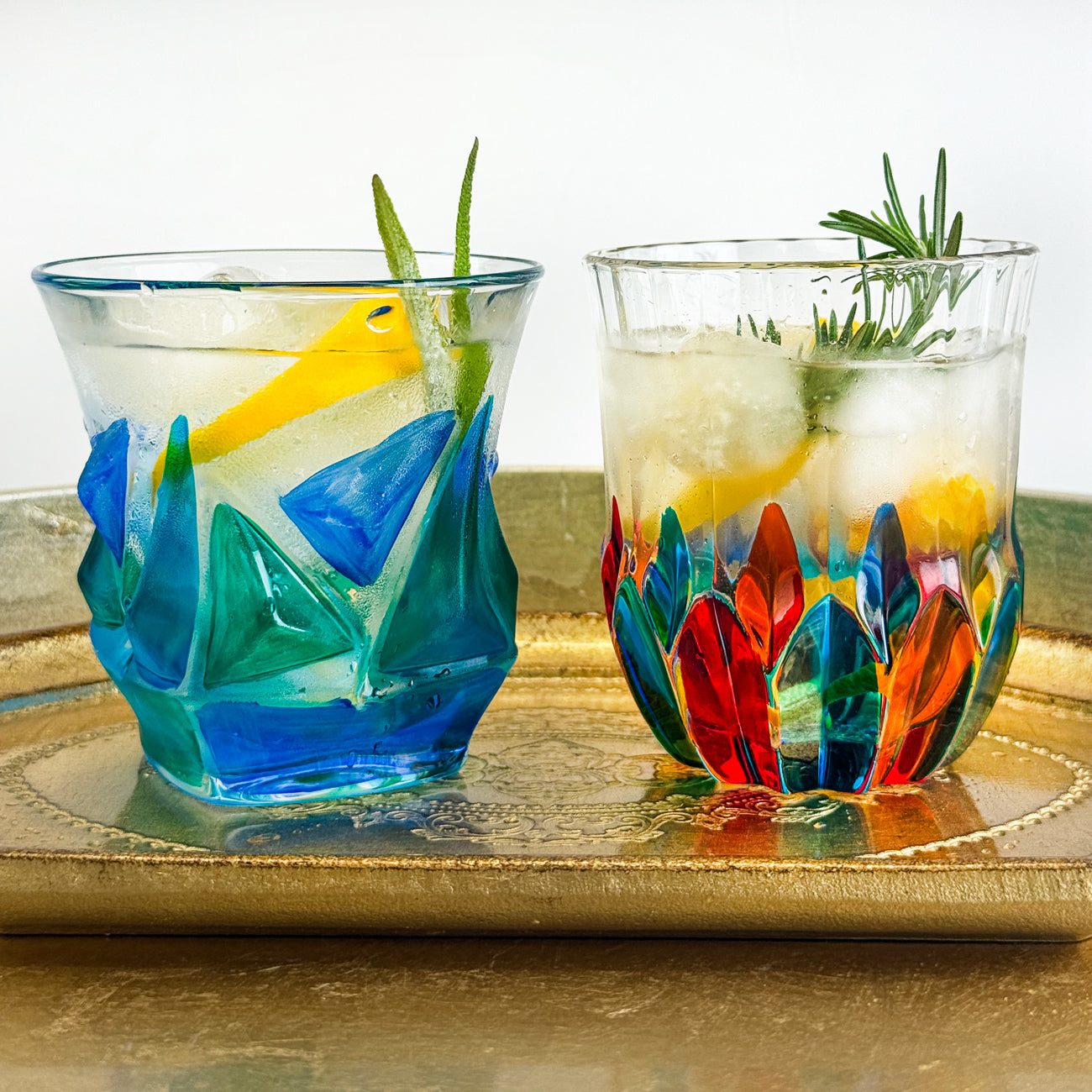 Raise a glass to the Empress glasses! This stunning set of 2 features hand-painted bright blues and greens on high quality Italian Crystal. Perfect for whiskey, rocks, or even your daily dose of water or juice. Cheers!
