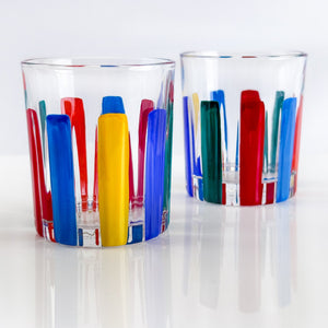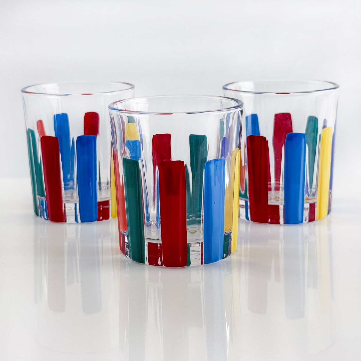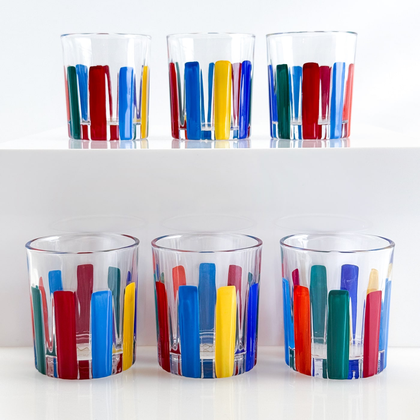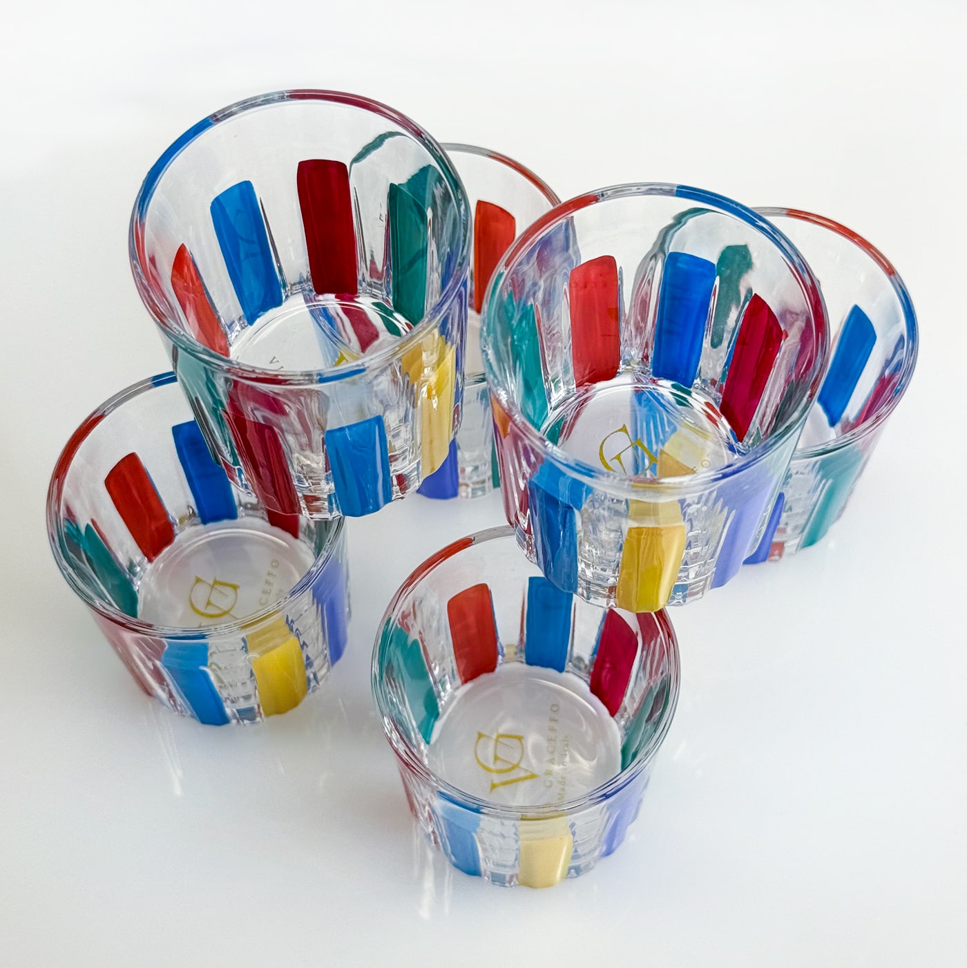 Raise a glass to style with this vibrant set of 6 Italian crystal shot glasses. Each piece showcases hand-painted artistry from Murano, featuring bold multicolor opaque designs that bring instant personality to your bar cart or table. Crafted from durable crystal, these beauties work equally well for toasts, espresso, or displaying as functional art.