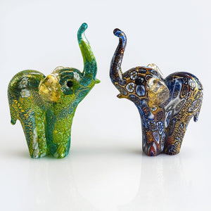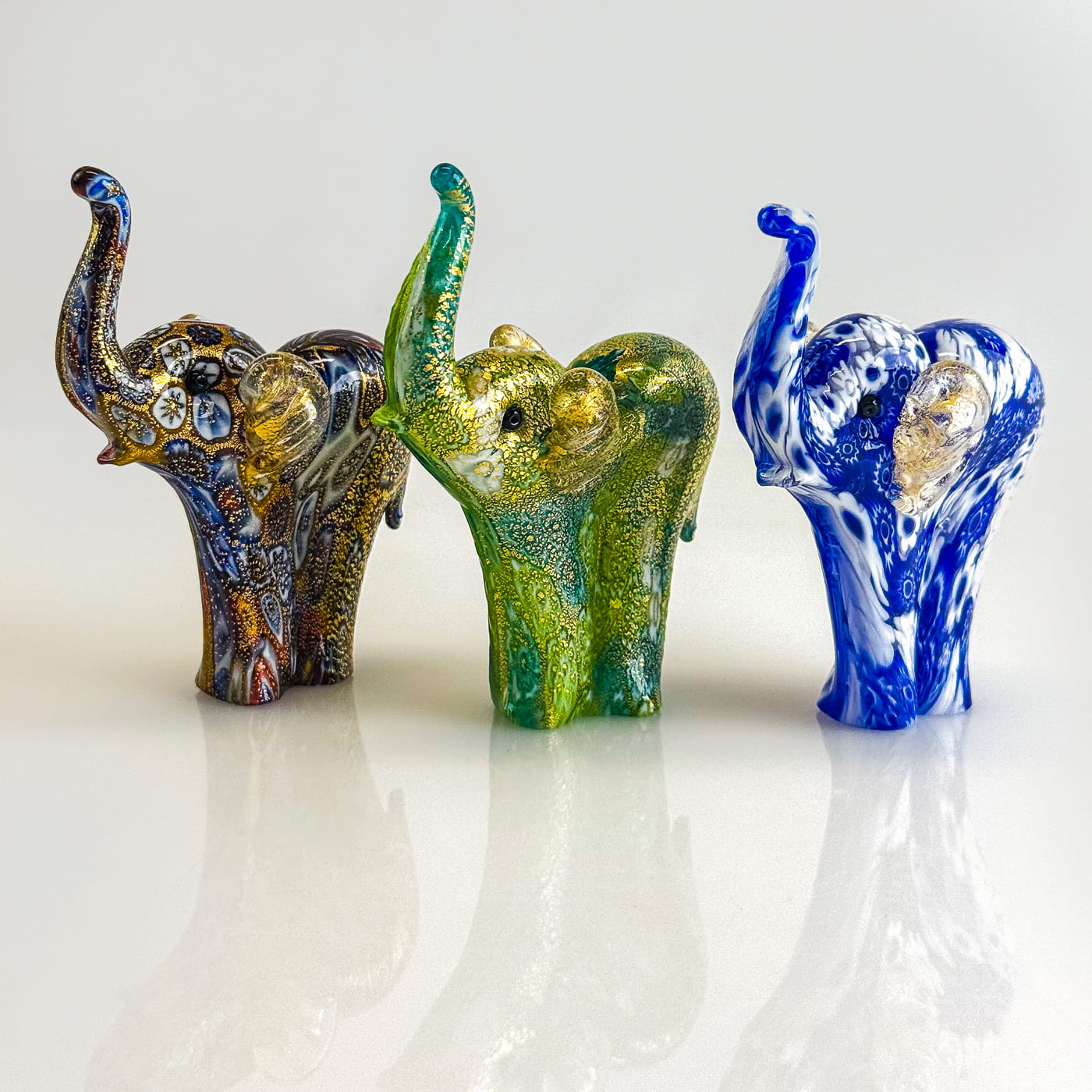 Our Murano Glass Elephant Figurine is made with the lamp work technique, these elephants are solid Murano glass (not blown glass, not hollow inside). Featuring mosaics of millefiori discs and is finished with 24-karat gold.
