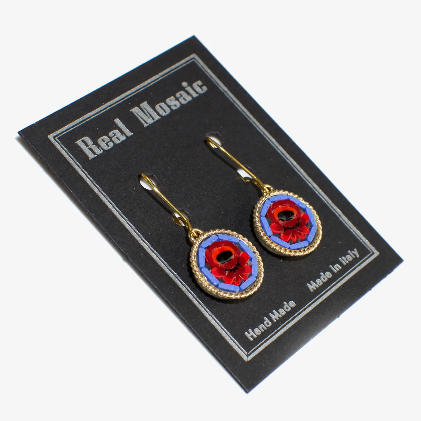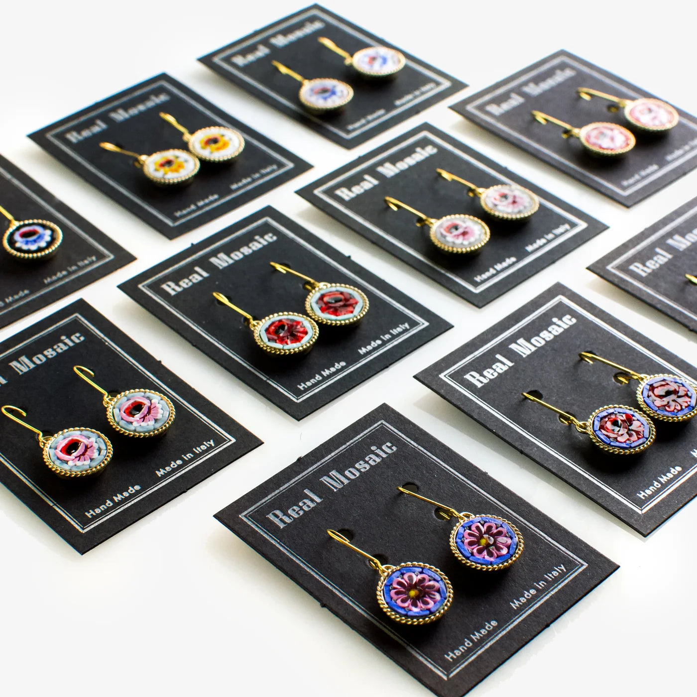 Handcrafted in Florence, these stunning mosaic earrings showcase an intricate large floral pattern rendered in traditional Italian artistry. Each piece features delicate gold plating that complements the vibrant mosaic design, creating an elegant statement accessory. The generous circular shape makes these earrings a bold fashion choice for those who appreciate authentic Italian craftsmanship and timeless beauty.