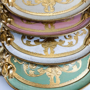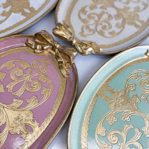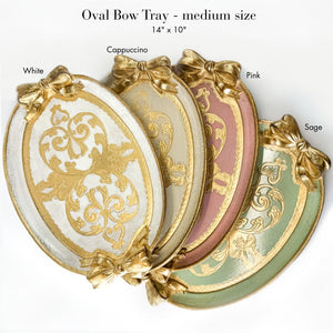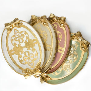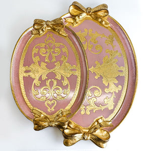 Introducing the Florentine Carved Oval Bow Tray, handmade in Florence, Italy. Showcasing a sweet coquette aesthetic, these gilded wood trays feature beautifully carved bow handles and an oval shape. Available in two sizes.