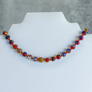This vibrant necklace showcases beautiful red millefiori beads set in a graduated pattern, with delicate red knots between each bead. This necklace, crafted with handmade Murano glass beads and delicate knots, highlights the skilled artistry of the glassmaker.