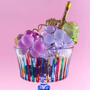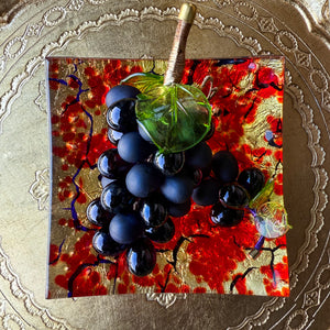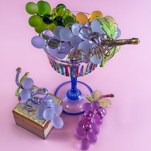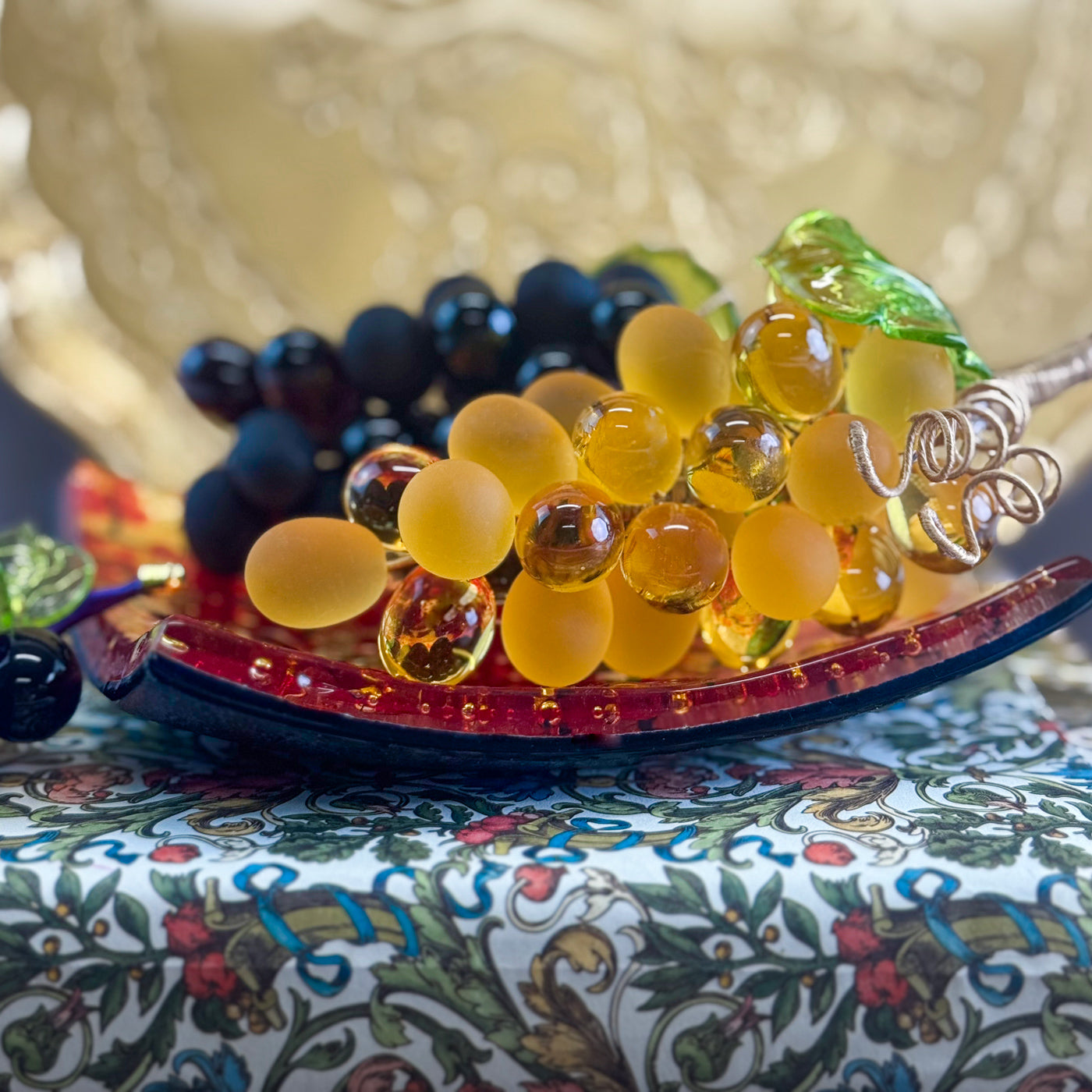 Dress up your home with a touch of Venetian luxury with this Murano glass grape cluster. This 32-piece cluster is handmade with beautiful, shiny, and matte, solid glass grapes, each attached to a satin-covered wire stem by artisans in Murano, Italy.