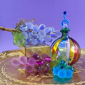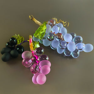 You'll love this enchanting cluster of grapes, handcrafted in Murano Glass with a mix of shiny and matte surfaces. The grapes are attached to a transparent green glass leaf with a delicately wrapped stem. Beautiful shades of green, amber and ruby red provide a choice of colors.