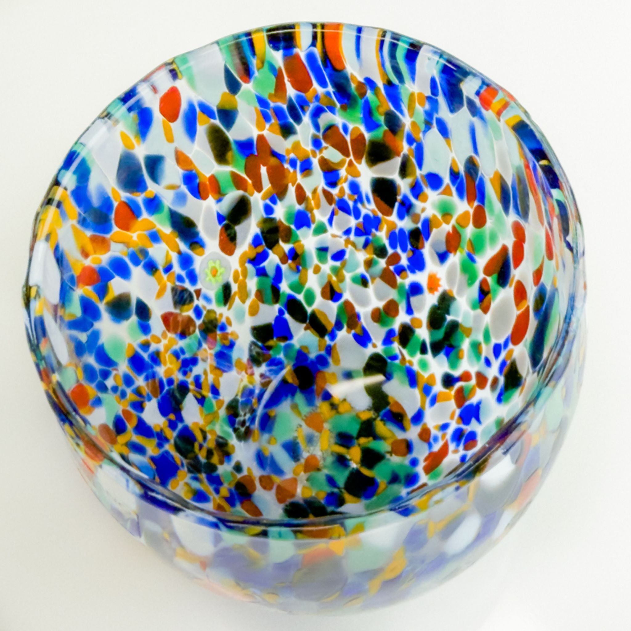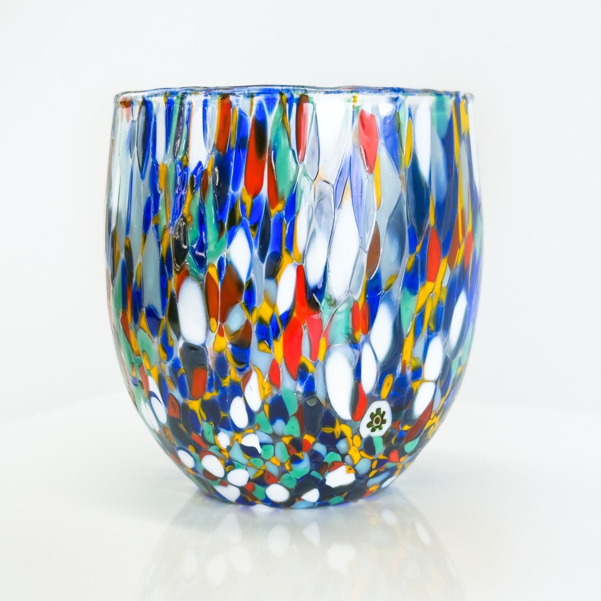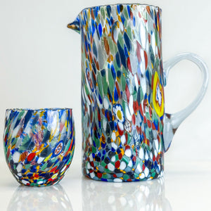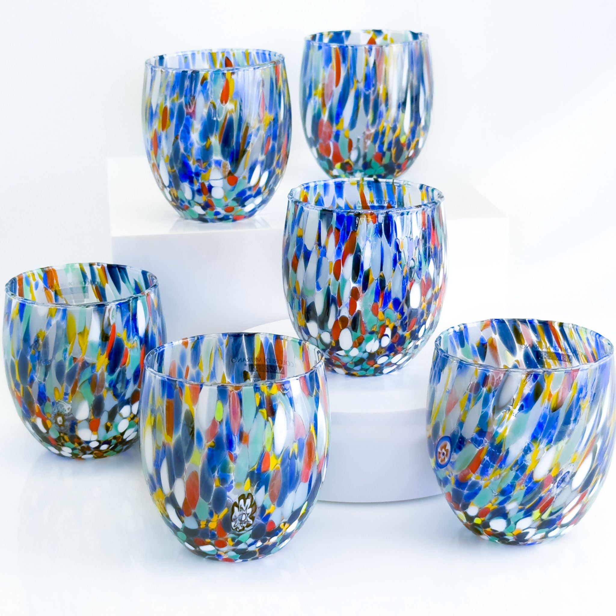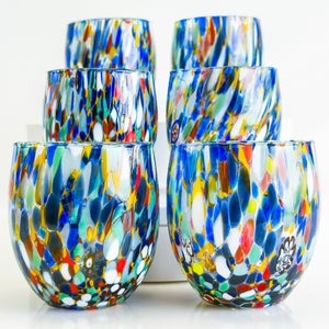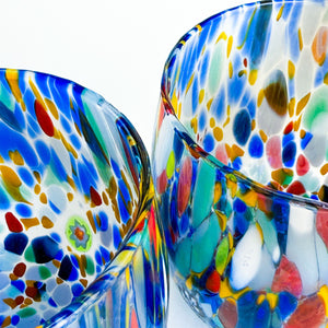 Raise a glass to Italian artistry with this vibrant set of two hand-blown Murano style tumblers. Each piece bursts with a kaleidoscope of colorful murrine swirls and delicate millefiori mosaic discs, creating a one-of-a-kind confetti effect that dances across the glass. Perfect for sipping your favorite beverages in style, these authentic Italian-crafted tumblers bring a splash of Mediterranean charm and whimsy to any table. Cheers to beauty in every sip!