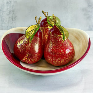Introducing the Murano Glass Red Pears in Bowl Set, handmade in Italy. This set includes three stunning handblown red pears with 24 karat gold accents, perfectly complemented by Murano Glass Spiral Bowl in red. Each piece is crafted from authentic Murano glass adding a touch of Italy to your home, or enjoyed as a unique gift.