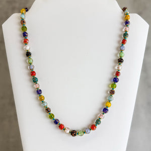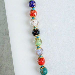 Add a splash of color and charm with this delightful Murano Glass Beaded Necklace. Featuring vibrant Murano glass beads and shimmering "avventurina" accents, each petite bead is knotted with a tiny turquoise blue knot. The gold finishes add a touch of sparkle, while the adjustable clasp with a heart stamped "Murano Glass" lets you wear it just right. Perfect for brightening any outfit with playful elegance!
