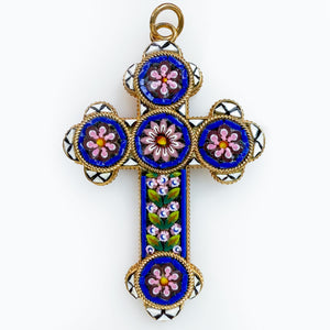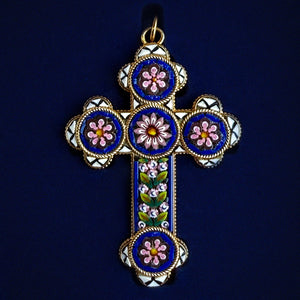 Handcrafted in Florence using centuries-old Byzantine mosaic techniques, this stunning cross pendant showcases vibrant floral blue Murano glass pieces meticulously arranged on a gold-plated base. Each brilliantly colored glass thread is individually cut and positioned by skilled Italian artisans, honoring a tradition that traces back to 5th-century Ravenna. This intricate art form nearly vanished but was revived in 19th-century Florence, where master craftspeople continue perfecting the painstaking process today. A wearable work of art that celebrates the dedication of Italy's dwindling community of mosaic experts.