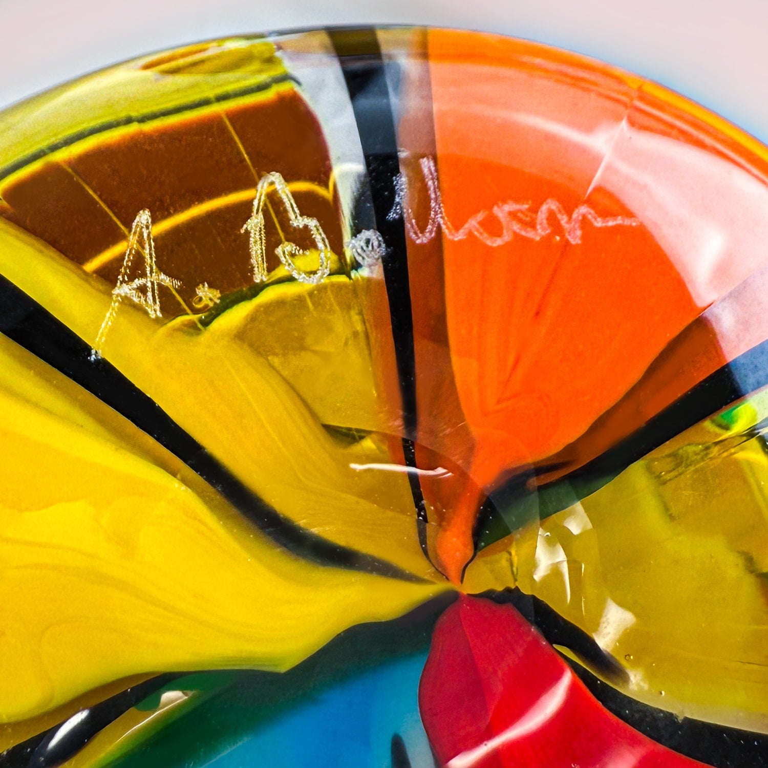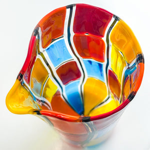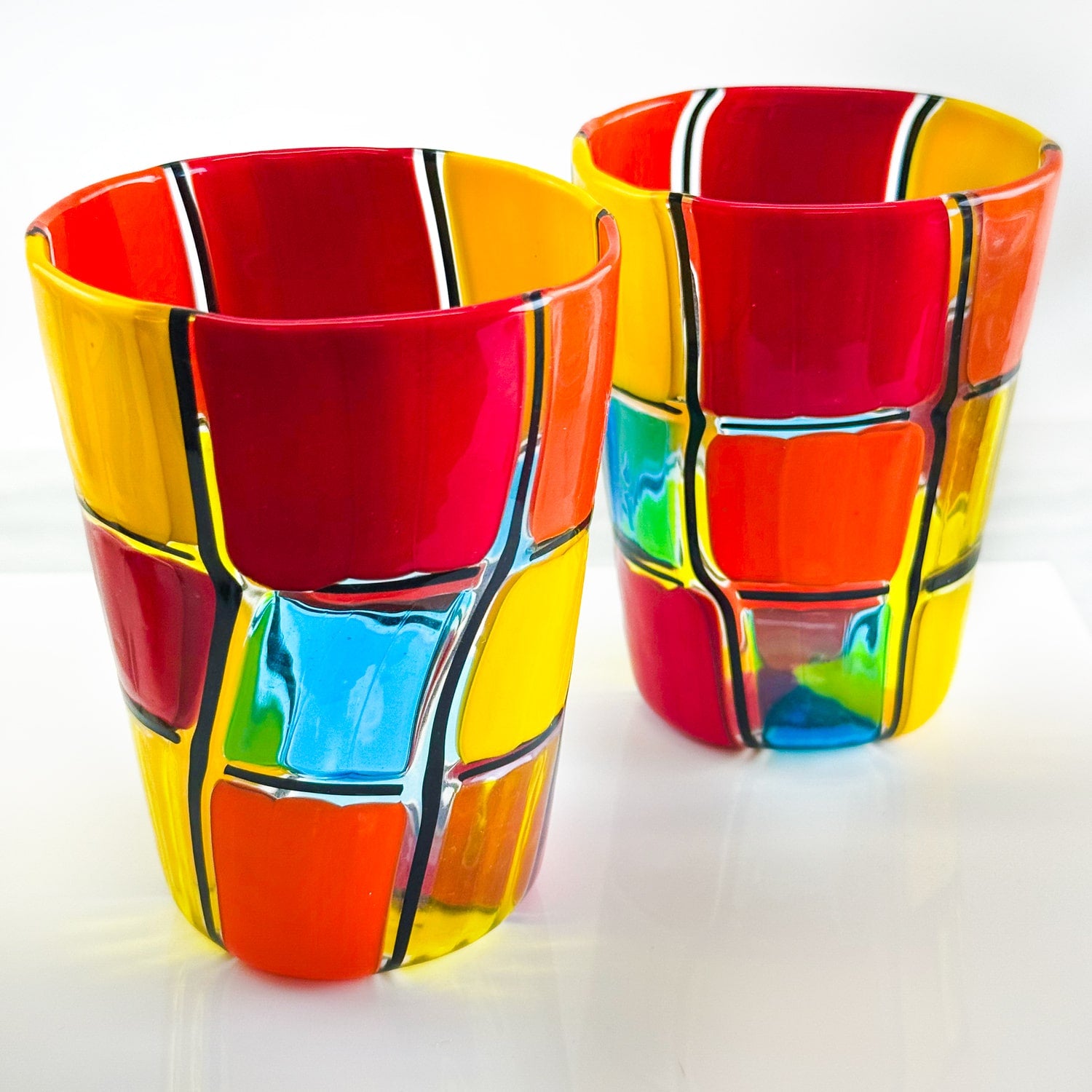 Handblown Murano glass created on the island of Murano, these stunning drinking glasses showcase a playful dance of red, orange, and yellow hues layered with cool blue tones in a striking checkerboard design. Each tumbler pairs transparent and opaque glass for visual depth and character. The matching carafe, signed by master artisan Angelo Ballarin, completes this vibrant set. Perfect for elevating everyday sips into a celebration of Italian glassmaking tradition and artisanal craftsmanship.