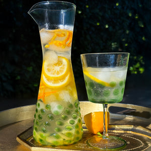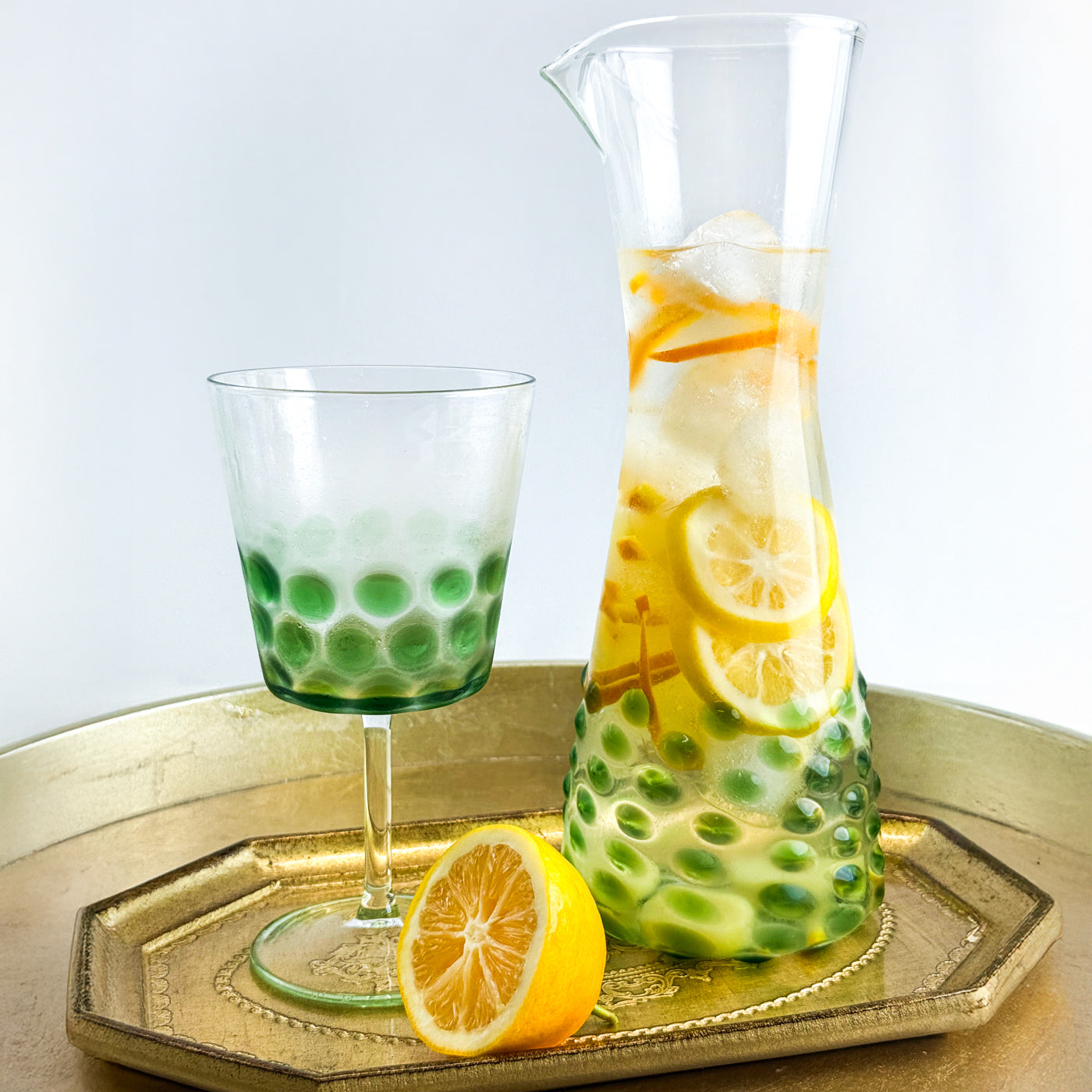 Elevate your tablescape with this charming Italian-crafted glass decanter, featuring delicate colored glass dots dancing across the bottom. Perfect for serving wine, water, or your favorite beverage, it pairs beautifully with our matching wine glasses and tumblers to create a coordinated, sophisticated look. Hand-blown with care in Italy, this piece brings artisanal elegance and a touch of whimsy to any gathering.