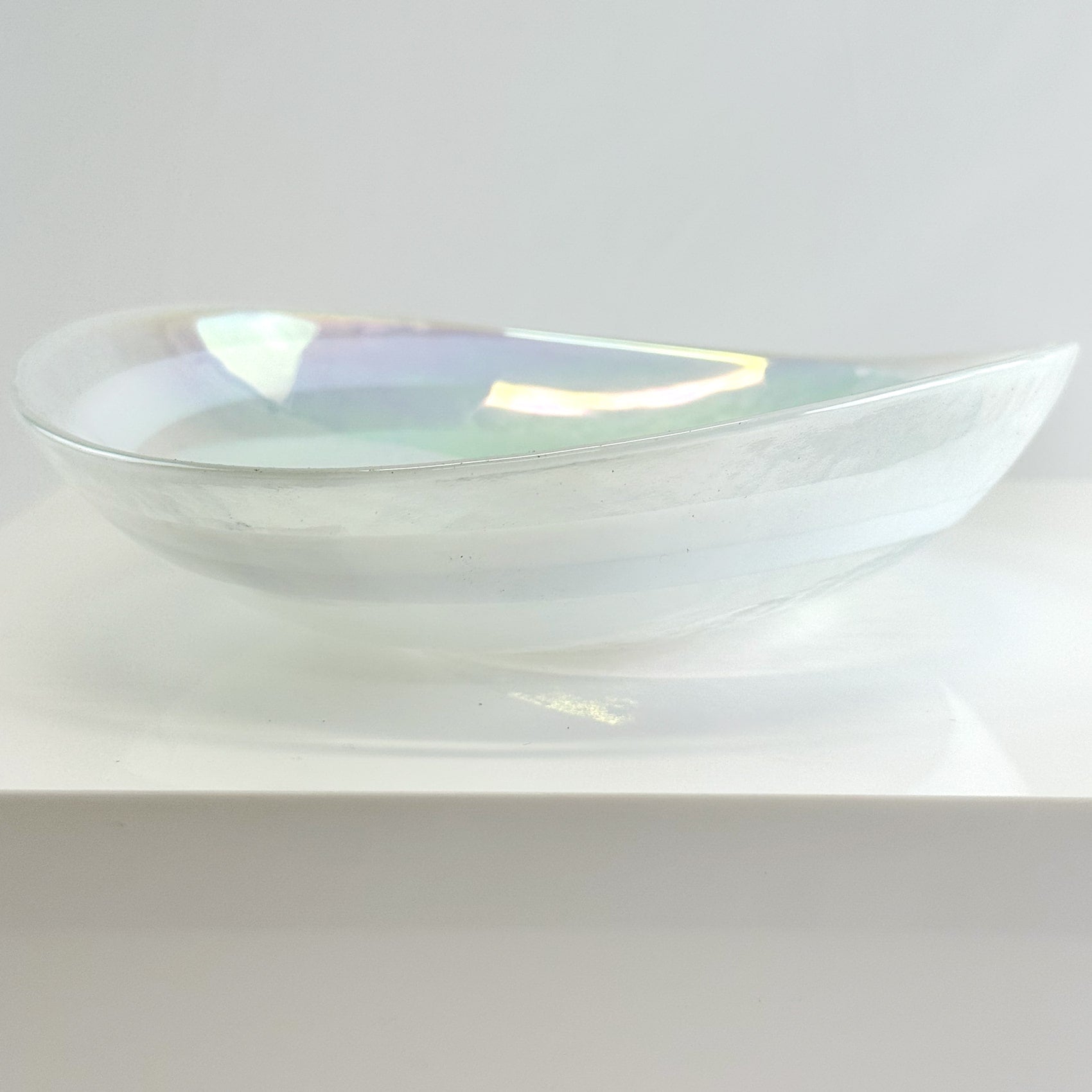 This wide and shallow bowl is made of 100% Murano Glass, and features a Spiral design of color. We chose this bowl as the perfect shape and size for displaying our glass fruit, or candies. It's equally perfect as a catch-all for jewelry, keys, or other small items. Completely food safe, and dishwasher safe, this bowl can be used for serving food as well. Featuring an opalescent color along with vibrant colored glass, this bowl is reminiscent of a shell. It makes a wonderful gift that is sure to be cherished.