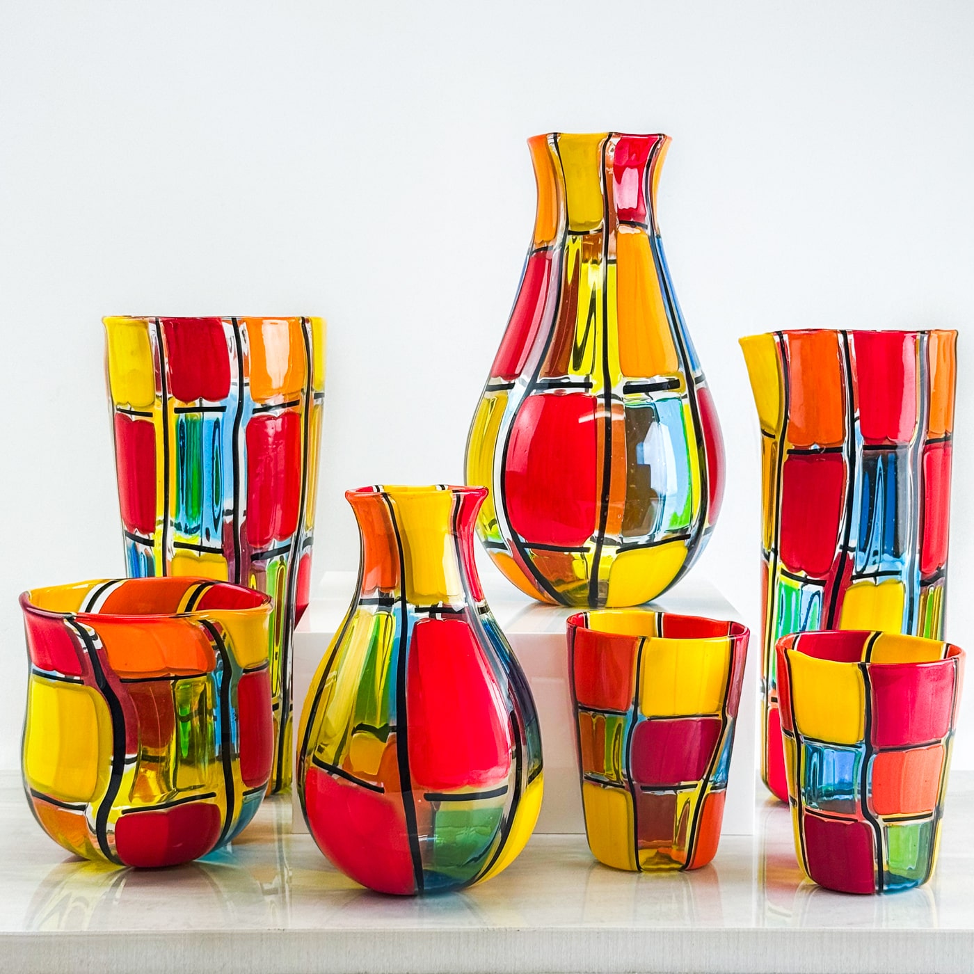 Introducing our exquisite Murano Glass Flower Vase, a true testament to the artistry and craftsmanship of Italy. Made by a third generation Master glass artisan, on the island of Murano. The style and design of the Pazzia Collection is completely unique. The red, yellow, and orange opaque glass, along with translucent blue and green vase captures and reflects light, creating a mesmerizing interplay of colors and patterns.