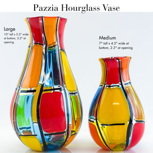 Introducing our exquisite Murano Glass Flower Vase, a true testament to the artistry and craftsmanship of Italy. Made by a third generation Master glass artisan, on the island of Murano. The style and design of the Pazzia Collection is completely unique. The red, yellow, and orange opaque glass, along with translucent blue and green vase captures and reflects light, creating a mesmerizing interplay of colors and patterns.