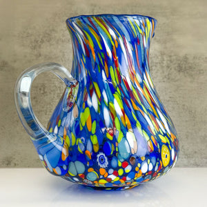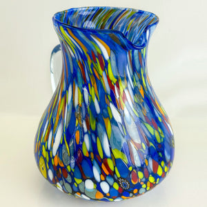 Crafted by skilled Italian artisans, this stunning hand-blown glass pitcher showcases rich cobalt blue glass adorned with vibrant murrine glass chips for a one-of-a-kind look. Built with substantial weight and durability, it's equally at home mixing cocktails, serving refreshing water, or displaying as functional art. The generous round shape and elegant design make it an unforgettable gift for anyone who appreciates authentic Italian craftsmanship and timeless style.
